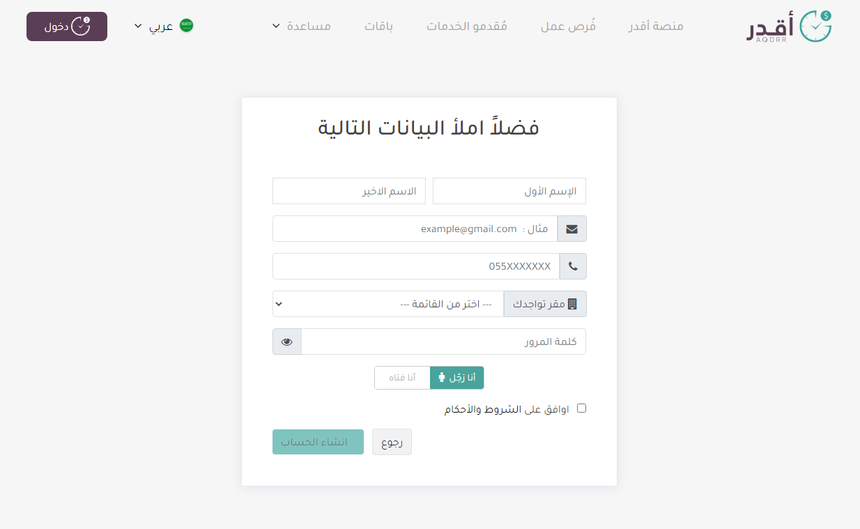 - لا بد من التسجيل في المنصة لدى الفئة الصحيحة التابع لها صاحب الحساب؛ مثلًا الباحث عن العمل يُسجل في تلك الفئة وليس مُقدم الخدمة.