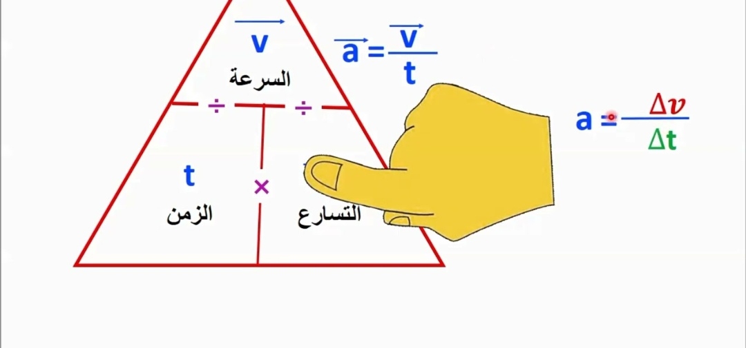 - الأول: التسارع يساوي التغير الحادث في السرعة/ التغير في الزمن.