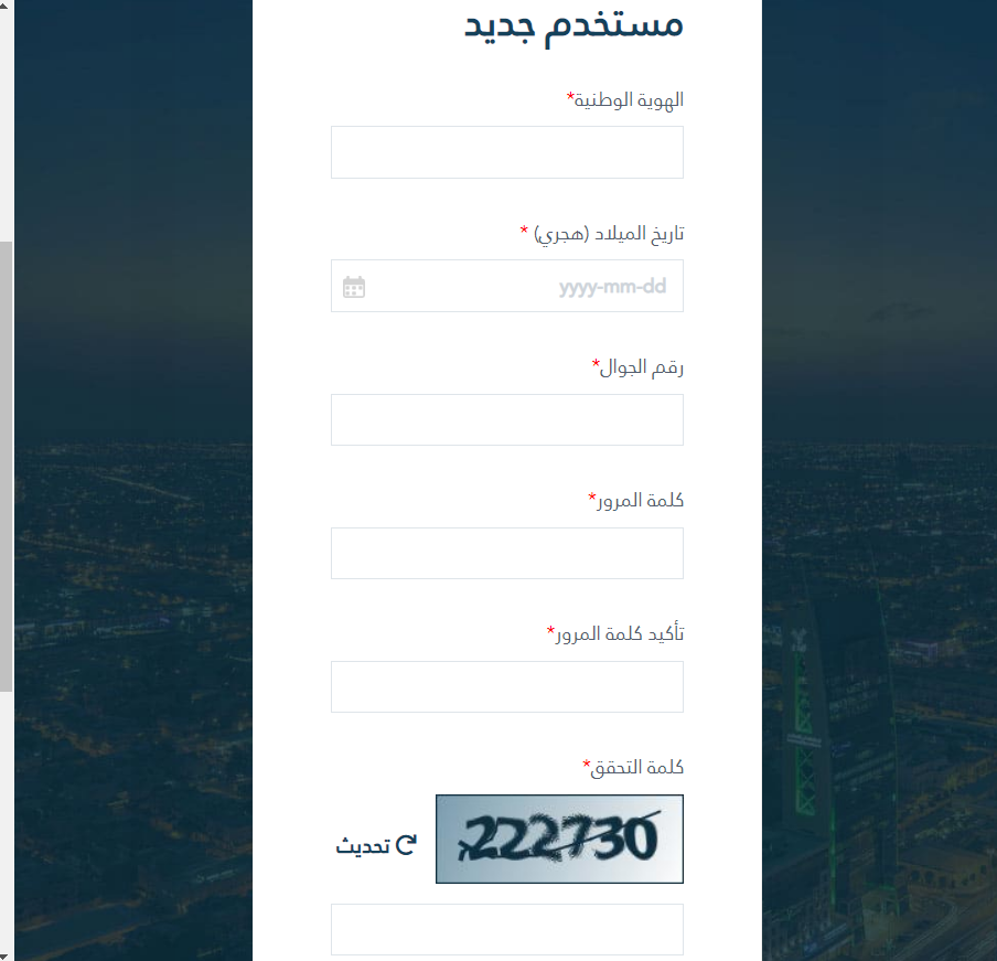 - هنا عليك كتابة رقم الهوية الوطنية الخاص بك، وأدخل تاريخ الميلاد الخاص بك، وكتابة رقم الهاتف وكلمة المرور والتأكيد عليها.