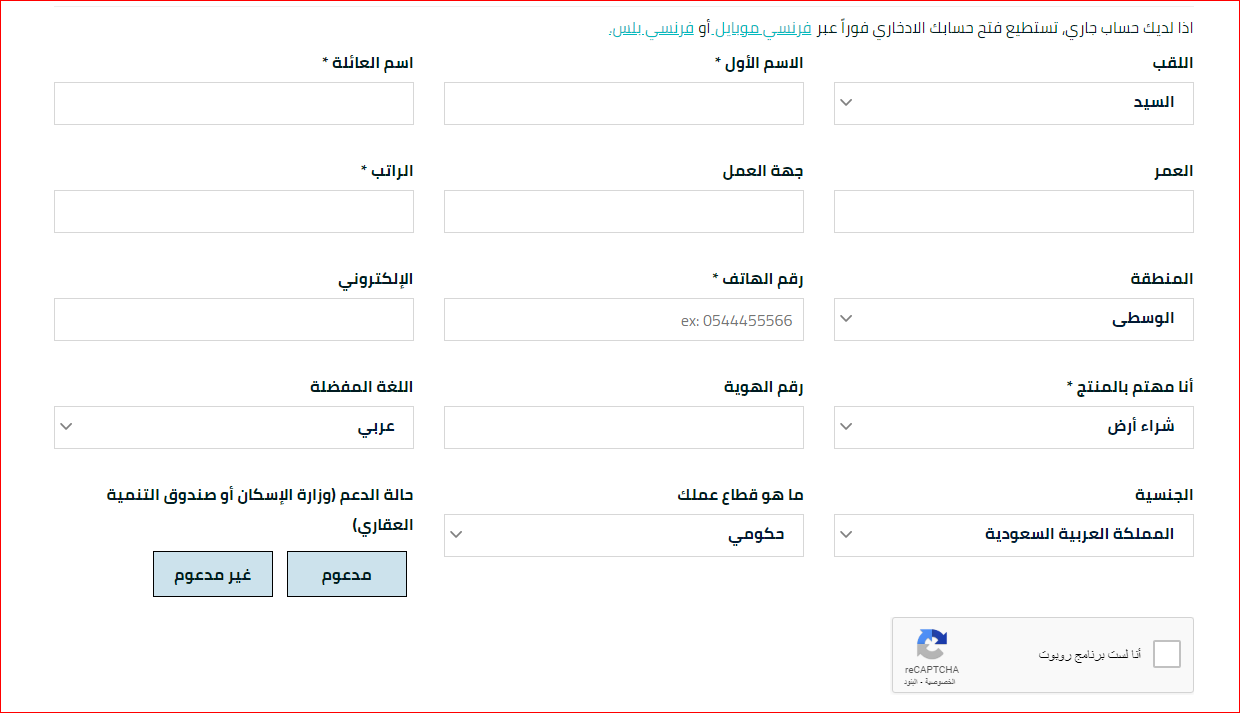 - قم بكتابة البيانات الشخصية الخاصة بك وبأسرتك (الاسم الأول، اسم الأب، اسم العائلة، العمر، جهة العمل، الراتب الشهري، رقم الهوية، قطاع العمل، البريد الإلكتروني، اللغة، الجنسية).