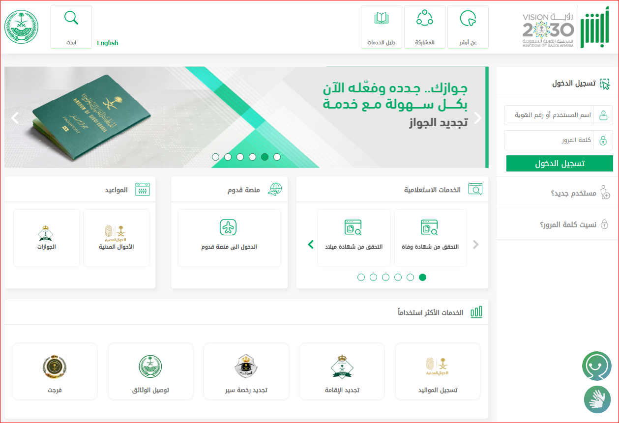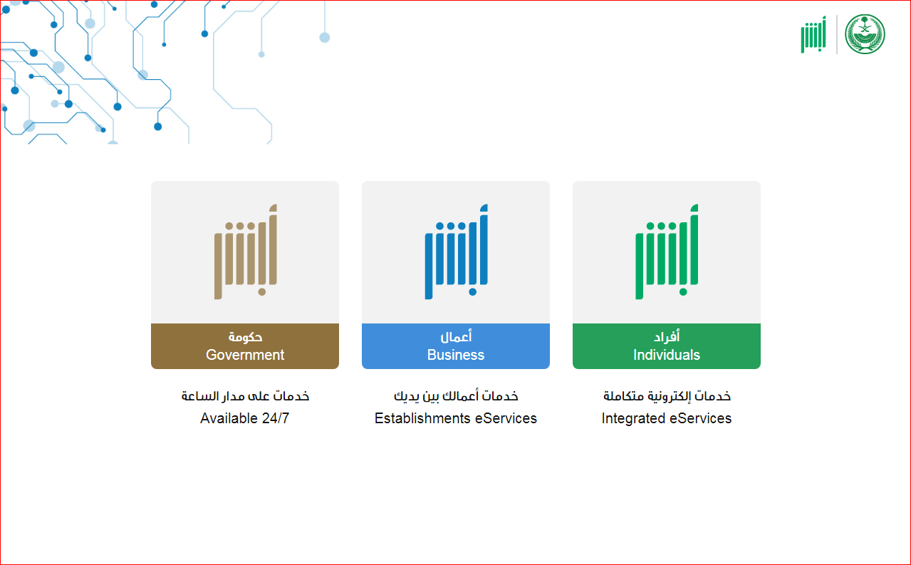 - تتوجه مباشرةً إلى الصفحة الرئيسية لخدمات أبشر الإلكترونية.