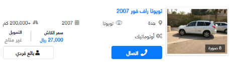 كما أن عداد الممشى للسيارة موديل 2005 قد سجل قراءة الأميال المقطوعة بنحو 416 ألف كيلو متر، والسيارة تويوتا كورولا فئة نصف فل، ويبلغ سعر السيارة 5000 ريال سعودي كاش.