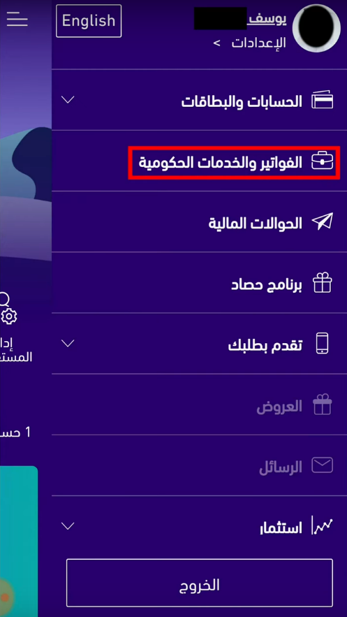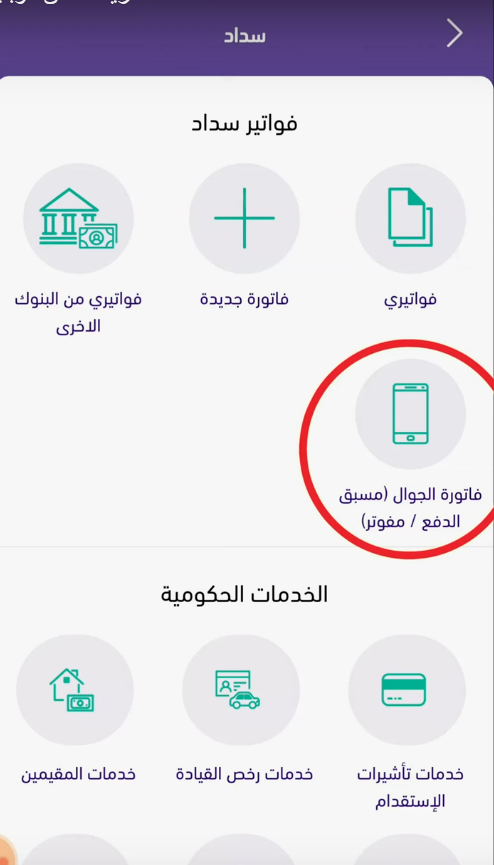- من القائمة الرئيسية اختر الفواتير والخدمات الحكومية.