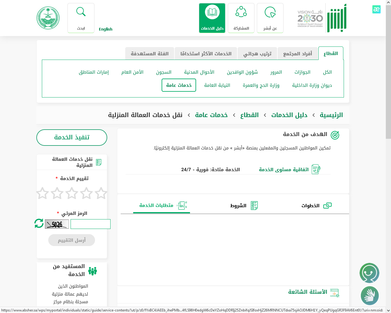 منصة أبشر تسمح بعدد كبير من الخدمات النافعة للمواطنين والمقيمين على رأسها نقل خدمات العمالة المنزلية بعد التحقق من الشروط والرسوم المطلوبة، والتي حددتها الجوازات السعودية.