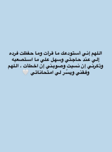 - باسمك اللهم استمد قوتي وأواجه مخاوفي، يا من شققت البحر لنبيك موسى وحفظت نبيك إبراهيم من عذاب النار أرجوك أن توفقني في مذاكرتي وتهديني سبل السلام.