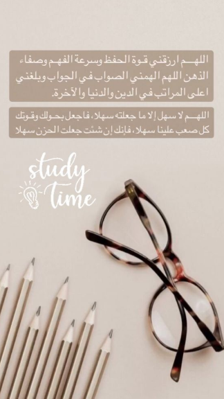 - بسم الله الرحمن الرحيم يا حي يا قيوم أسألك توفيقًا، حفظًا، فهمًا وعقلًا مُستنيرًا، اللهم ارزقني بهذا العلم حسناتٍ لا تُعد ولا تُحصى وابنِ لي بها بيوتًا في الجنان.