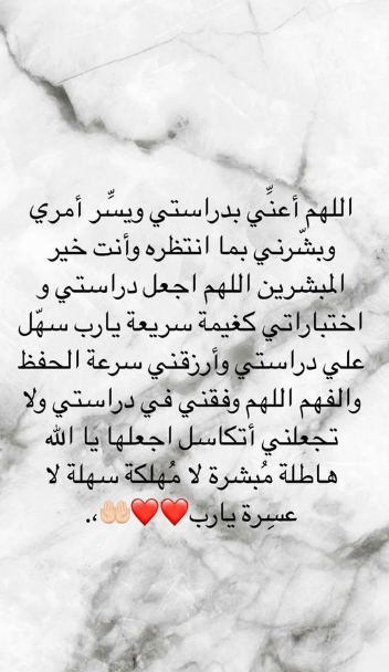 - اللهم أسألك أن تجبر خاطري وأهلي وأن توفقني في دراستي وأن تجعل علمي في ميزان حسناتي وأن ينفعني يوم لا ينفع مالٌ ولا بنون.