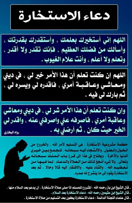 "اللَّهُمَّ إنِّي أَسْتَخِيرُكَ بِعِلْمِكَ، وَأَسْتَقْدِرُكَ بِقُدْرَتِكَ، وَأَسْأَلُكَ مِنْ فَضْلِكَ الْعَظِيمِ فَإِنَّكَ تَقْدِرُ وَلا أَقْدِرُ، وَتَعْلَمُ وَلا أَعْلَمُ، وَأَنْتَ عَلامُ الْغُيُوبِ.. اللَّهُمَّ إنْ كُنْتَ تَعْلَمُ أَنَّ هَذَا الأَمْرَ (اذكر حاجتك) خَيْرٌ لِي فِي دِينِي وَمَعَاشِي وَعَاقِبَةِ أَمْرِي؛ فَاقْدُرْهُ لِي وَيَسِّرْهُ لِي ثُمَّ بَارِكْ لِي فِيهِ.. اللَّهُمَّ وَإِنْ كُنْتَ تَعْلَمُ أَنَّ هَذَا الأَمْرَ (اذكر حاجتك) شَرٌّ لِي فِي دِينِي وَمَعَاشِي وَعَاقِبَةِ أَمْرِي فَاصْرِفْهُ عَنِّي وَاصْرِفْنِي عَنْهُ وَاقْدُرْ لِي الْخَيْرَ حَيْثُ كَانَ ثُمَّ ارْضِنِي بِهِ".