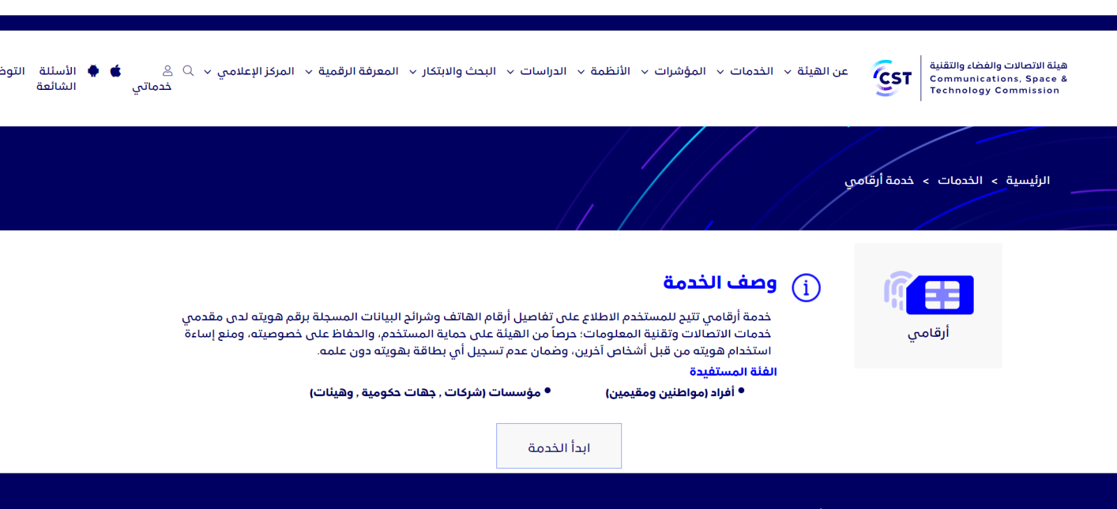 - يبدأ المستخدم بالدخول إلى خدمة "أرقامي" من خلال الموقع الإلكتروني الخاص بالهيئة.