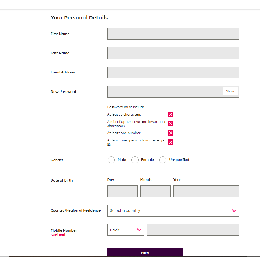 - قم بكتابة البيانات المطلوبة المتمثلة في اسم اللاعب الأول والاسم الأخير واسم العائلة وعنوان البريد الإلكتروني.