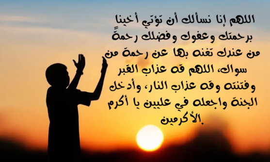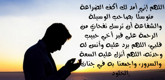- نسألك اللهم الرحمة والمغفرة لأخانا الذي فارقنا وفطر قلوبنا على فراقه، فيا رب العالمين ارحمه وثبته عند السؤال ونجه من العذاب وآمنة من الخوف، ويا رب العالمين انقله من ضيق اللحود ومواطن الدود إلى جنات الخلود.