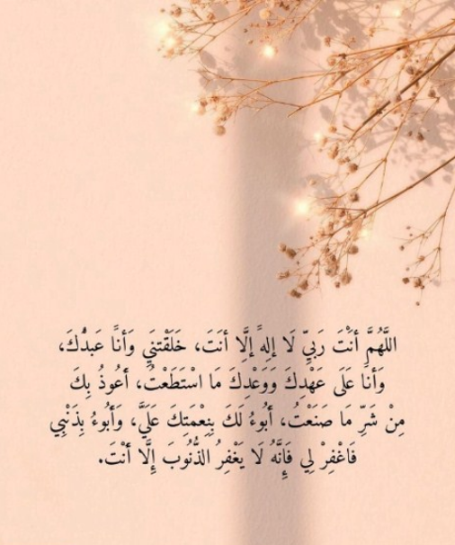 - "اللَّهُمَّ أنْتَ رَبِّي لا إلَهَ إلَّا أنْتَ، خَلَقْتَنِي وأنا عَبْدُكَ، وأنا علَى عَهْدِكَ ووَعْدِكَ ما اسْتَطَعْتُ، أعُوذُ بكَ مِن شَرِّ ما صَنَعْتُ، أبُوءُ لكَ بنِعْمَتِكَ عَلَيَّ، وأَبُوءُ لكَ بذَنْبِي فاغْفِرْ لِي؛ فإنَّه لا يَغْفِرُ الذُّنُوبَ إلَّا أنْتَ".