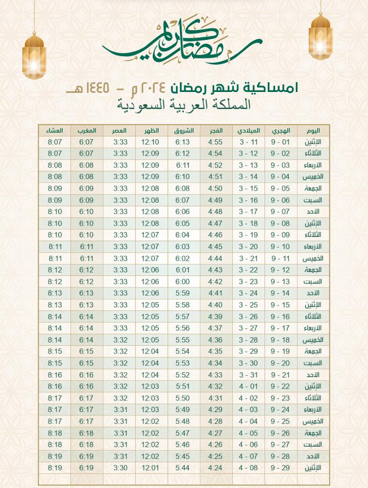 إمساكية شهر رمضان 2024م