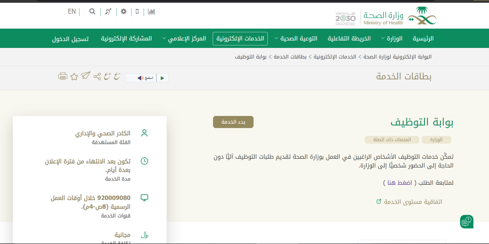 أتاحت وزارة الصحة في المملكة العربية السعودية رابطًا يخص الخدمات الخاصة بالتوظيف في الوزارة، حيث يساعد هذا الرابط على الاطلاع على كافة الوظائف التي تُتاح من خلال الوزارة مع تحديد الوظيفة المناسبة والتقدم بها.
