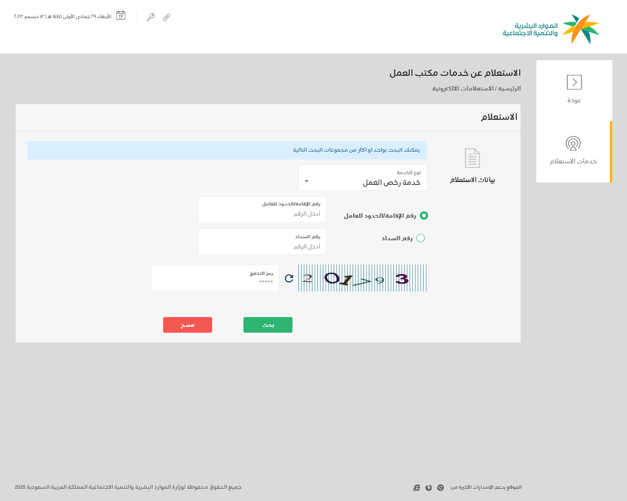 - قم بتدوين البيانات المطلوبة مثل رقم الإقامة أو رقم حدود العامل.