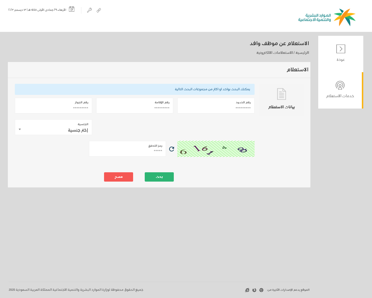 - اختر خدمة الاستعلام ثم حدد الاستعلام عن موظف وافد.