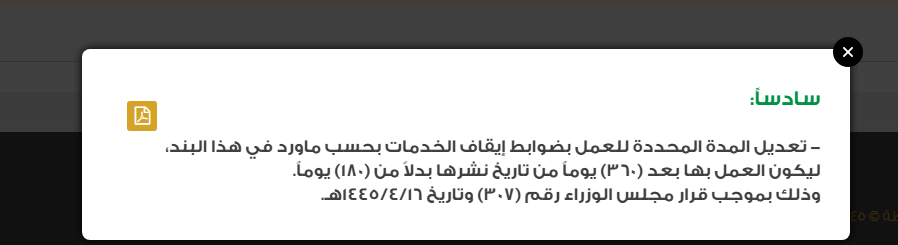إذ إن مجلس الوزراء كان قد نشر ضوابط إيقاف الخدمات في تاريخ 17 مارس 2023 الموافق 25 شعبان 1444 هـ، وتقرر أن يتم العمل بها بعد مرور 180 يومًا من هذا التاريخ.