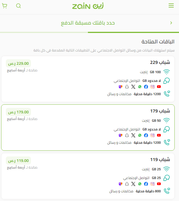 في الجدول التالي نعرض لكم مجموعة من الباقات الخاصة بزين وتكون مسبقة الدفع: