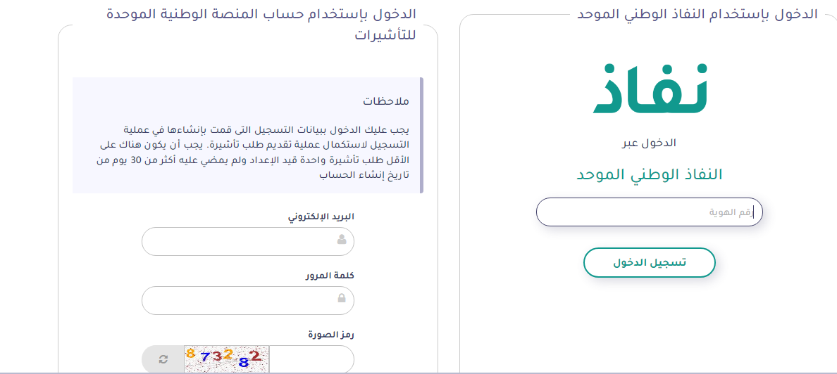 - تسجيل الدخول بحساب النفاذ الوطني الموحد أو بحساب المنصة الوطنية للتأشيرات.