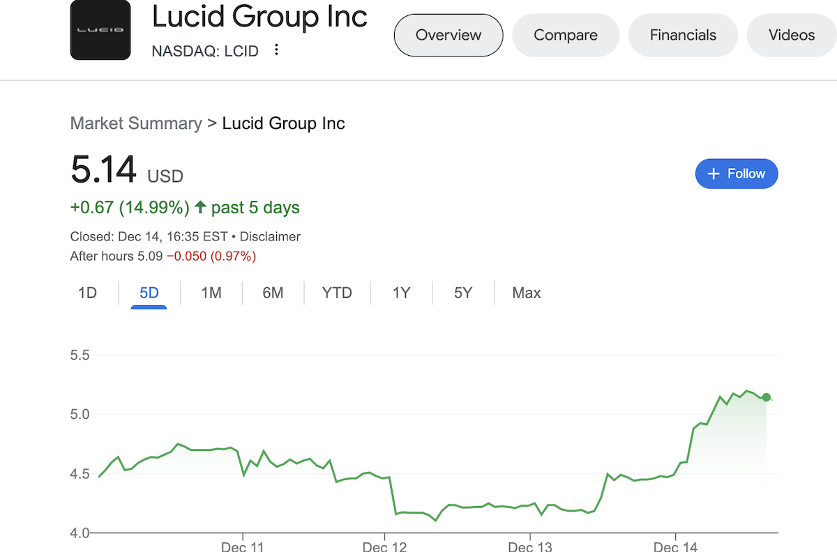 ونتيجة للكثير من العوامل والمشكلات التي تواجهها الشركة، انخفض سعر سهم لوسيد بنسبة 70% منذ عام، وسط مخاوف الركود وحرب الأسعار التي أشعلتها شركة تسلا الرائدة في السوق الأميركي.