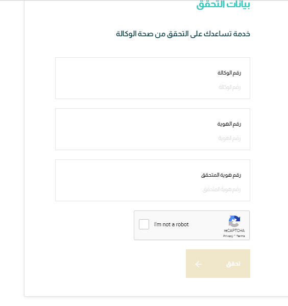 - املأ البيانات المطلوبة عبر المنصة (رقم الوكالة، ورقم هوية المتحقق، ورقم الهوية).