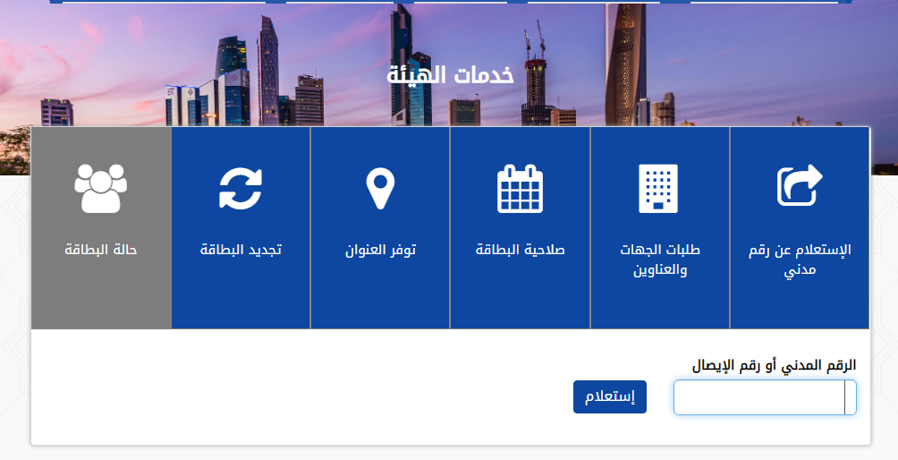 الاستعلام عن جاهزية البطاقة المدنية وطلب توصيل البطاقة المدنية للمنزل من بين الخدمات المهمة المتاحة في موقع الهيئة العامة للمعلومات المدنية لكل من المواطنين والمقيمين في الكويت، إذ إنه يمكن الاستعلام عن حالة البطاقة إذا تأخرت عن موعدها المحدد.