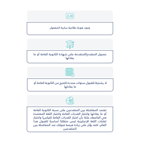 - بالنسبة لاختبارات؛ القدرات العامة، اللغة الإنجليزية وكفايات ليسوا من شروط القبول لكن أيضًا على أساسهم تتم المفاضلة بين الطلاب.