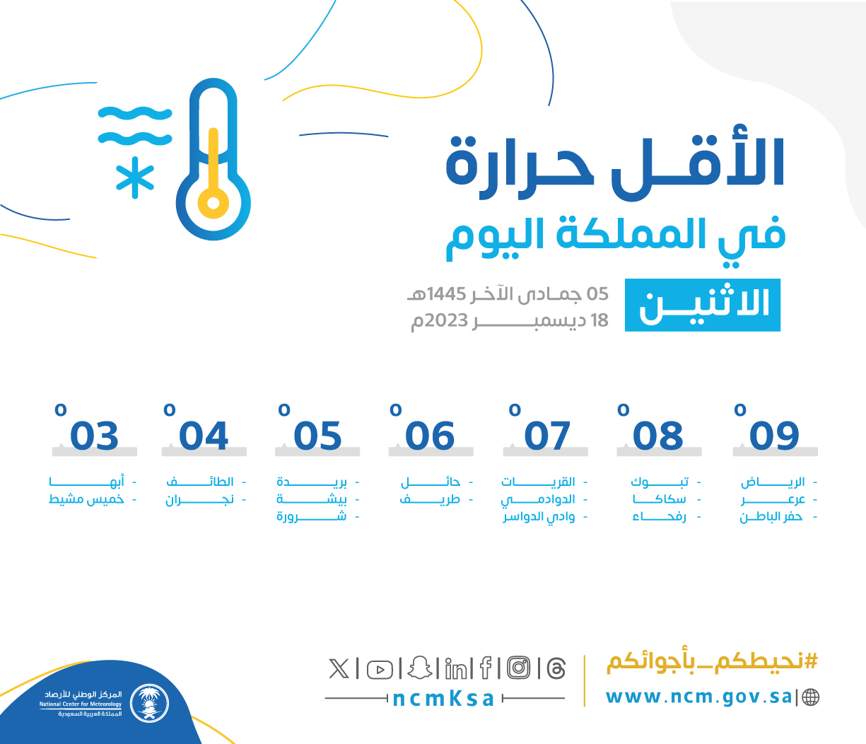بحسب تقرير المركز الوطني للأرصاد فإن اقل درجة حرارة تم رصدها اليوم الأثنين الموافق 18 ديسمبر في السعودية كانت في مدينتي ابها وخميس مشيط حيث بلغت درجة الحرارة الصغرى 3 درجات مئوية، اما في الطائف ونجران فقد بلغت 4 درجات مئوية.