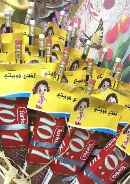 - توزيع مجموعة من المجسمات التي تمثل حروف اللغة مع قطع من الحلوى على الأطفال.