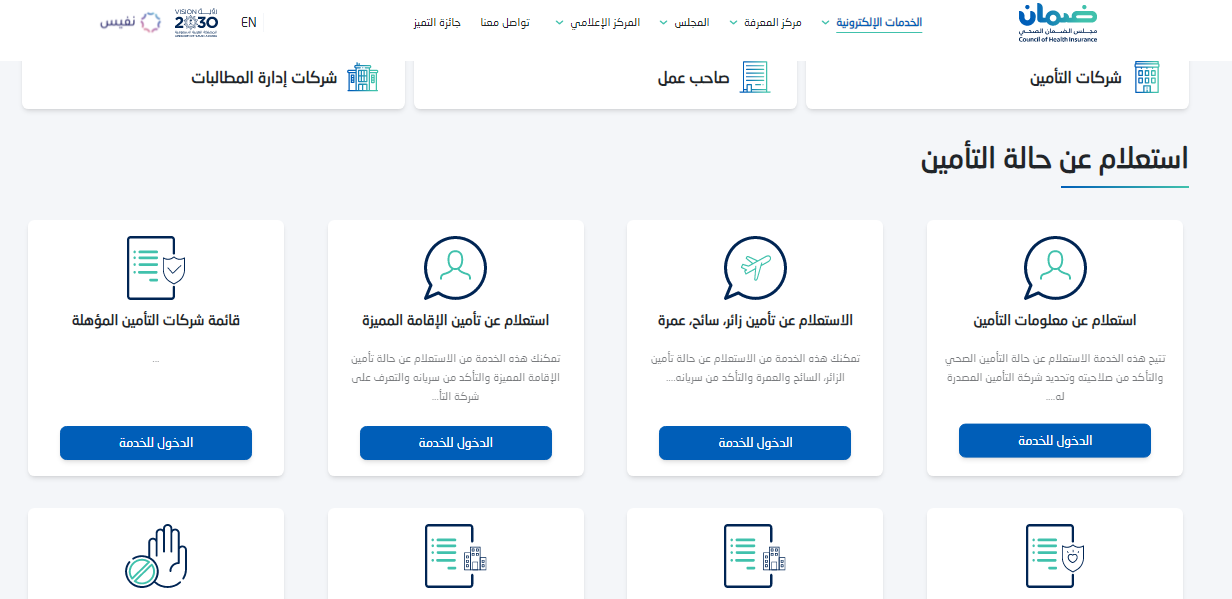 أتاح مجلس الضمان الصحي في المملكة العربية السعودية فرصة الاستعلام عن التأمين الطبي من خلال رقم الهوية أو رقم الإقامة إلكترونيًا عبر موقع المجلس الرسمي في أي وقت، وذلك في إطار تحقيق رؤية 2030.