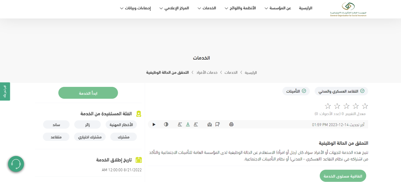 - النقر على خيار "ابدأ الخدمة" للبدء في عملية التحقق من اشتراك التأمينات.