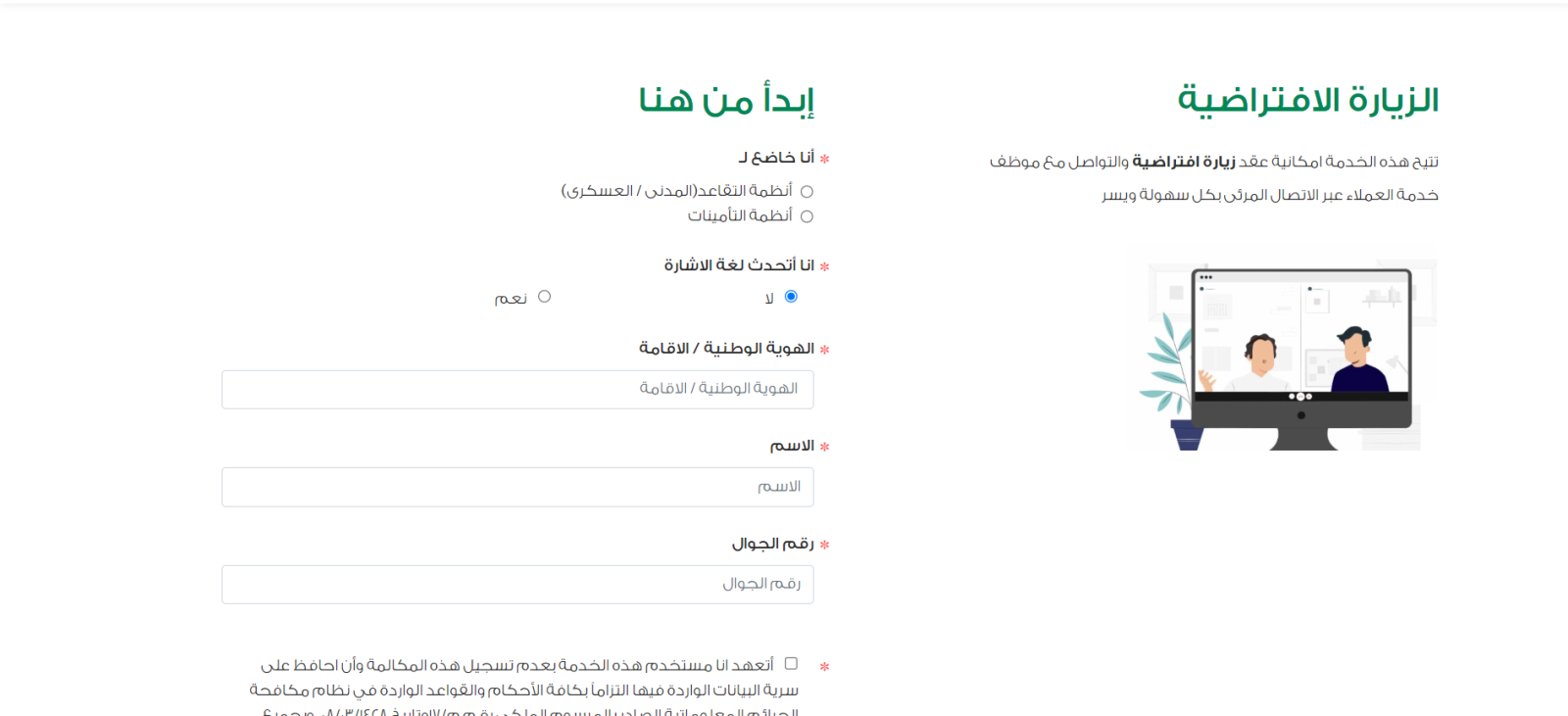عبر خدمة الزيارة الافتراضية في التأمينات الاجتماعية، يُمكنك القاء مقابلة مع موظف خدمة العملاء وإنهاء معاملاتك بكل سهولة دون الحاجة للذهاب إلى فرع التأمينات، يمكنك الوصول إلى هذه الخدمة عبر اتباع الخطوات التالية: