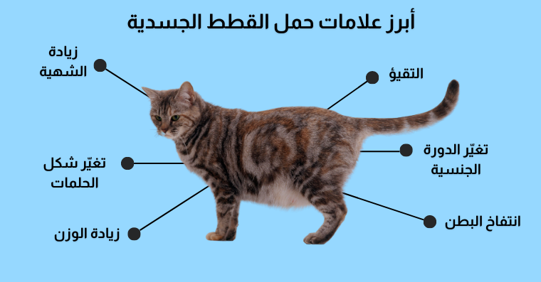 إن القطط عندما تحمل تظهر عليها مجموعة من الأعراض التي من المهم معرفتها من قِبل المربيين، وهي ما سنوضحها عبر النقاط التالية: