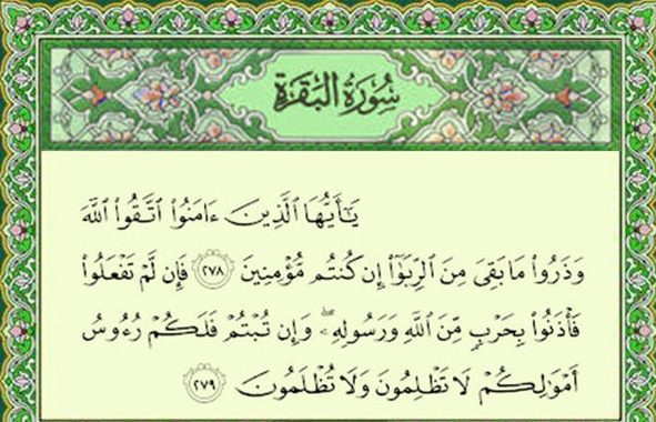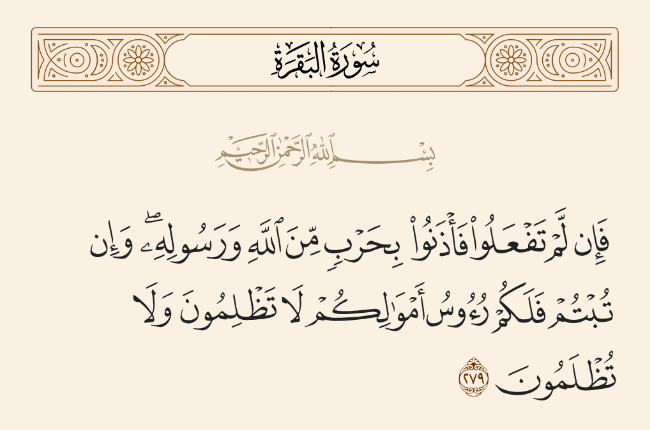 {يَا أَيُّهَا الَّذِينَ آمَنُواْ اتَّقُواْ اللَّهَ وَذَرُواْ مَا بَقِيَ مِنَ الرِّبَا إِن كُنتُم مُّؤْمِنِينَ فَإِن لَّمْ تَفْعَلُواْ فَأْذَنُواْ بِحَرْبٍ مِّنَ اللَّهِ وَرَسُولِهِ وَإِن تُبْتُمْ فَلَكُمْ رُؤُوسُ أَمْوَالِكُمْ لاَ تَظْلِمُونَ وَلاَ تُظْلَمُونَ} [البقرة: 278 – 279].