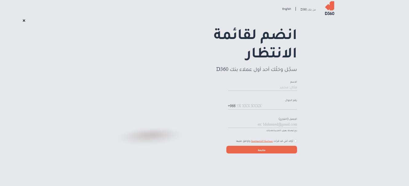 يتمكن العميل سواء كان حامل الجنسية السعودية أو مقيم داخل المملكة من التسجيل في بنك D360 من خلال الحجز في قائمة الانتظار الخاصة بالبنك ليكون من أوائل الحاصلين على خدمات البنك فور إطلاقها، وذلك بإتباع الخطوات التالية: