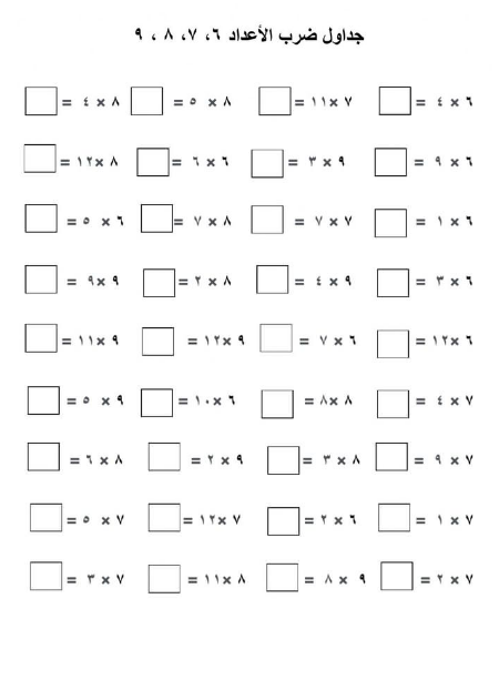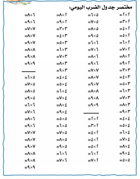 - نموذج أسئلة على جدول الضرب من الأعداد 2 حتى 9.