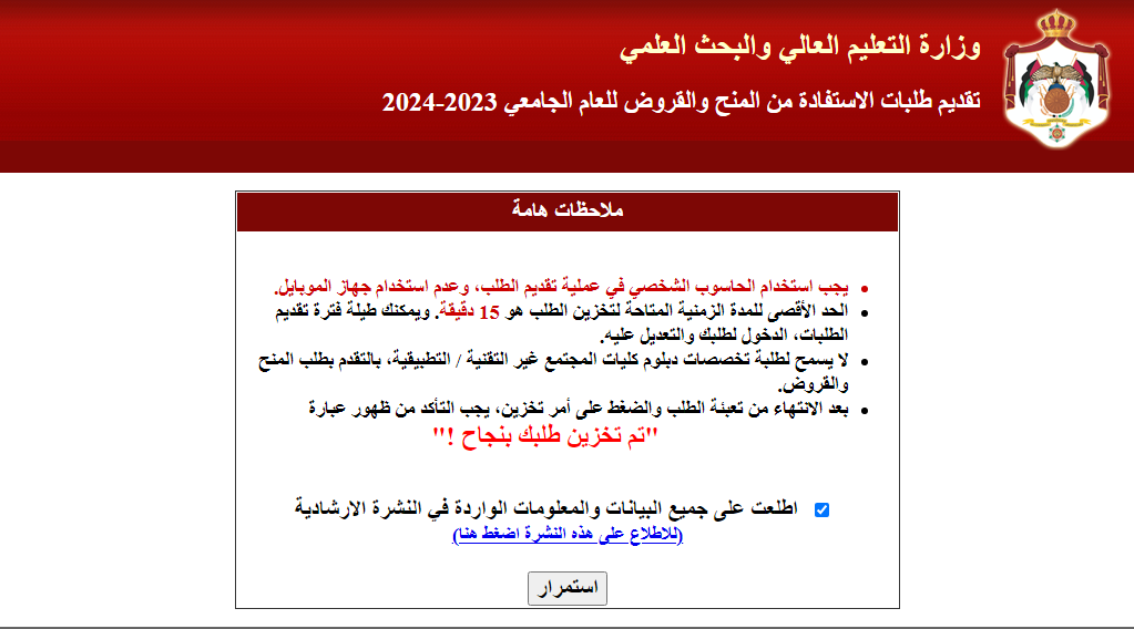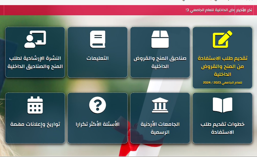 تم الإعلان من قِبل مديرية البعثات في وزارة التعليم العالي والبحث العلمي للطلبة أردنيين الجنسية الملتحقين بالجامعات الأردنية الرسمية عن بدء تقديم الطلبات الخاصة بالمنح والقروض الداخلية وذلك لعام 2023/2024م، حيث سيتم التقديم من بداية صباح الأحد الموافق السابع عشر من ديسمبر عام 2023 حتى مساء يوم الأربعاء الموافق السابع والعشرين من ديسمبر عام 2023م.