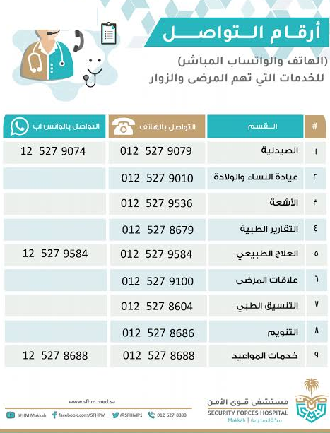 قامت مستشفى قوى الأمن في المملكة العربية السعودية بتخصيص رقم هاتف موحد ومجاني لإجراء حجز موعد، وهو 0966118024444، وغيره للتواصل، وهي تتمثل فيما يلي: