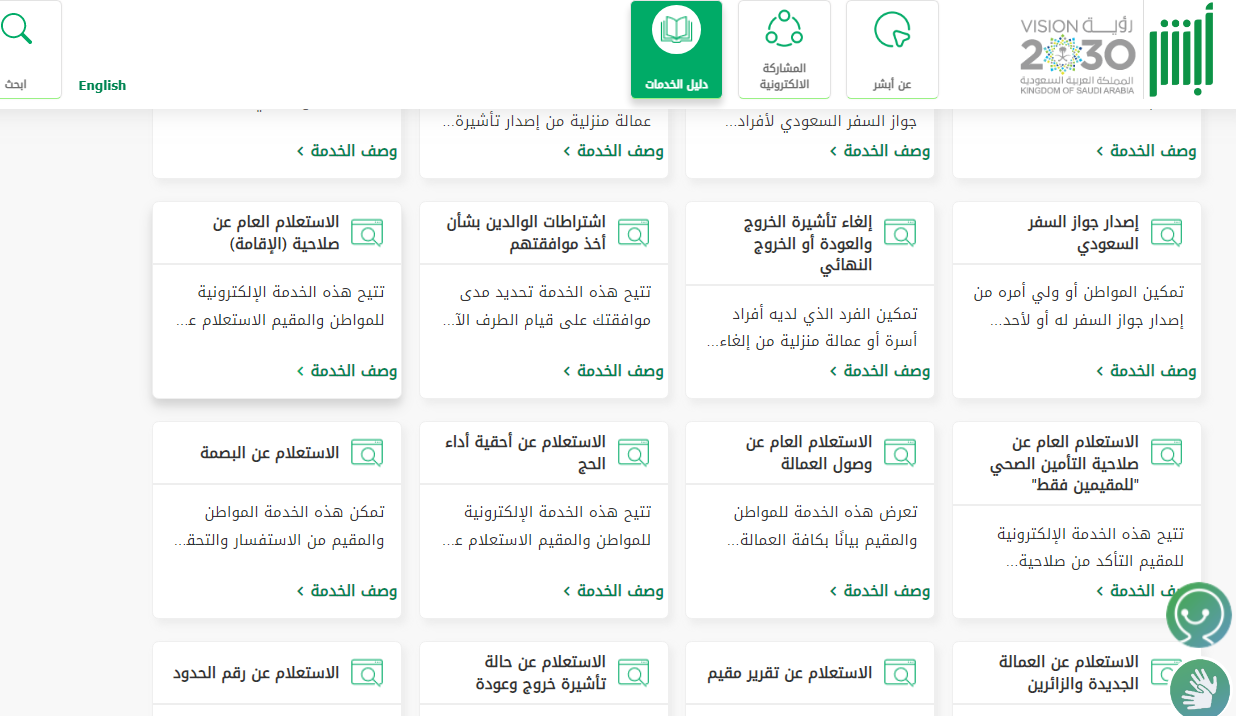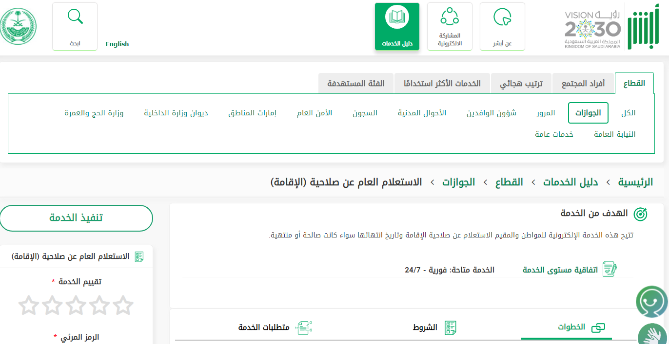 - العثور على خدمة "الاستعلام العام عن صلاحية الإقامة" من الخدمات المتاحة.
