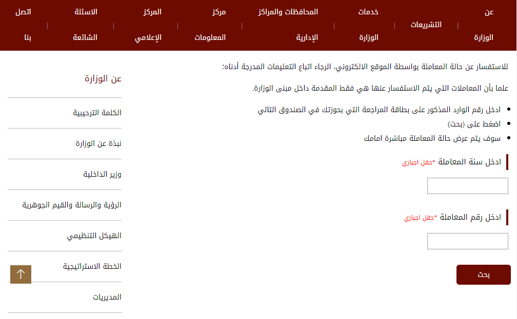 قامت وزارة الداخلية بالإعلان عن إمكانية الاستعلام عن معاملة في الوزارة بشكل إلكتروني من موقع الوزارة الرسمي، ويتم ذلك من خلال اتباع الخطوات الآتية: