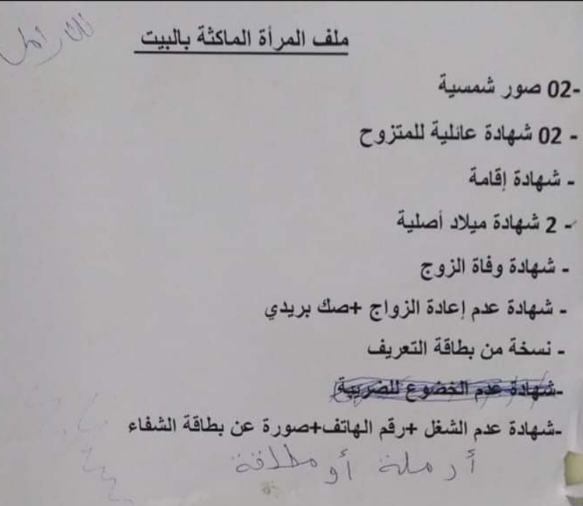 للحصول على منحة المرأة الماكثة في البيت في الجزائر، يتعين على المتقدمة تقديم مجموعة من المستندات الضرورية، إليك قائمة بالمستندات المطلوبة: