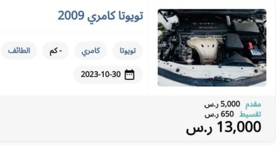 هي سيارة بنظام التقسيط والتي تصل إلى 8000 ريال سعودي للقسط ويكون المقدم الخاص بها هو 1000 ريال سعودي وتبلغ قيمة القسط الشهري 300 ريال سعودي وهي التي تتمتع بناقل الحركة الأوتوماتيكي، يكون اللون الخارجي الخاص بها هو فضي وهي تعمل بالبنزين وتكون المسافة المقطوعة بها 190000 كيلو متر ويمكن التواصل مع البائع لمعرفة التفاصيل عبر الرقم 0596264453