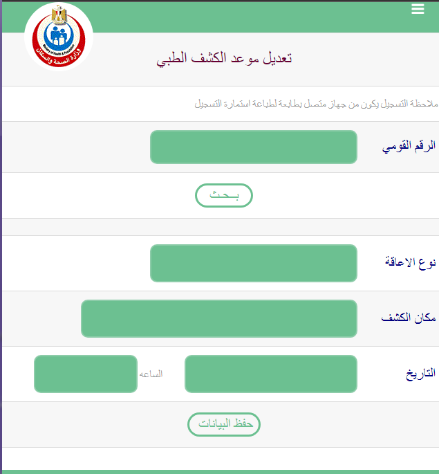 - تعبئة كافة البيانات المطلوبة المكونة من الرقم القومي ونوع الإعاقة علاوة على مكان الكشف والتاريخ الذي تريد تحديده.