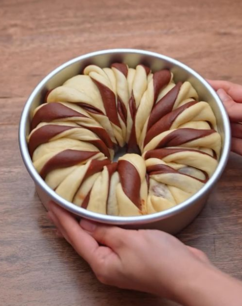 - يتم فرد العجينة على صورة مستطيل ووضع عجينة الشوكولاتة فوق العجينة السادة.