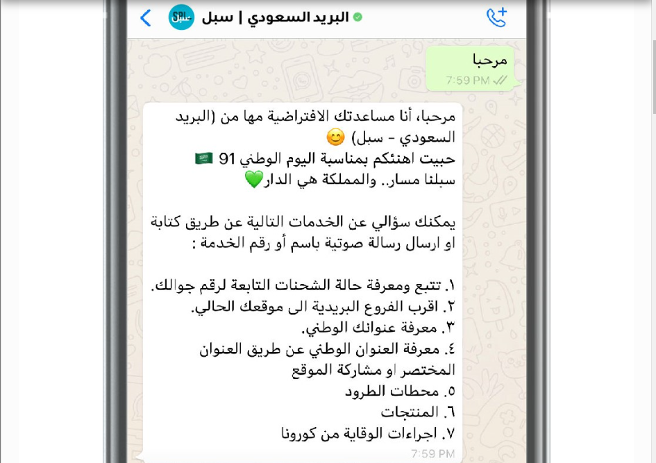 - قم بإرسال رسالة عبر تطبيق واتساب إلى الرقم 96611289888+، واكتب في الرسالة كلمة "مرحبا".