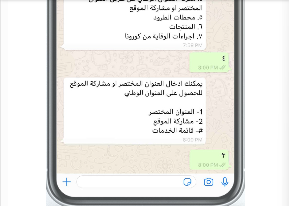 تقدم هذه الخدمة الجديدة من البريد السعودي عبر الواتساب وسيلة مبتكرة ومريحة للمستخدمين للوصول إلى معلوماتهم الشخصية، بفضل التكنولوجيا، يمكنكم الآن معرفة العنوان الوطني بسرعة ويسر عبر التواصل مع الهيئة البريدية السعودية بسهولة عبر تطبيق الواتساب