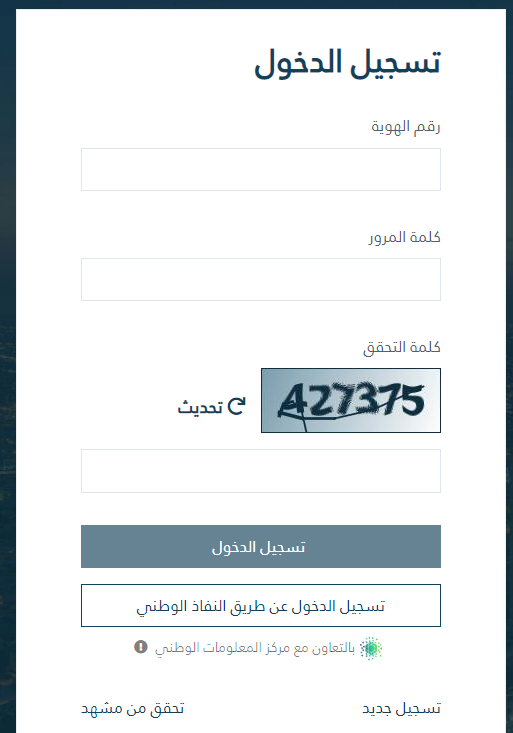 - يتم تسجيل الدخول من خلال إدخال رقم الهوية وكلمة المرور فضلًا عن رمز التحقق، كما يمكن أن يتم تسجيل الدخول من خلال النفاذ الوطني.