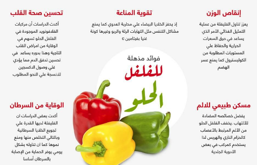 يحتوي الفلفل الحلو على العديد من الفوائد التي لا تعد ولا تحصى، ومن خلال ما يلي نعرض لكم أشهر تلك الفوائد: