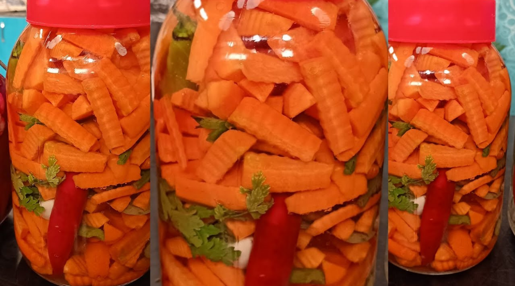 - قم بتقطيع الجزر المقطع إلى شرائح أو المبشور في برطمان نظيف ثم يُضاف إليه خليط الماء الساخن مع السكر والخل والملح.