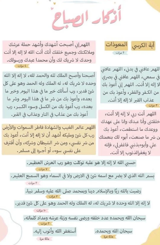 - أَصْـبَحْنا وَأَصْـبَحَ المُـلْكُ لله وَالحَمدُ لله، لا إلهَ إلاّ اللّهُ وَحدَهُ لا شَريكَ لهُ، لهُ المُـلكُ ولهُ الحَمْـد، وهُوَ على كلّ شَيءٍ قدير، رَبِّ أسْـأَلُـكَ خَـيرَ ما في هـذا اليوم وَخَـيرَ ما بَعْـدَه، وَأَعـوذُ بِكَ مِنْ شَـرِّ ما في هـذا اليوم وَشَرِّ ما بَعْـدَه، رَبِّ أَعـوذُ بِكَ مِنَ الْكَسَـلِ وَسـوءِ الْكِـبَر، رَبِّ أَعـوذُ بِكَ مِنْ عَـذابٍ في النّـارِ وَعَـذابٍ في القَـبْر.